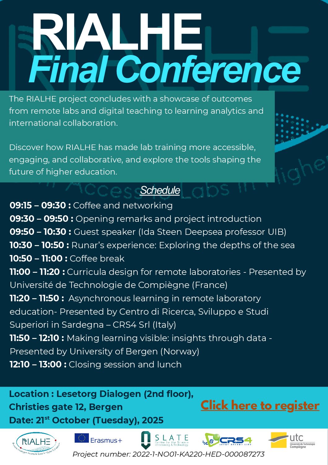 At the conference, we will showcase the main outcomes of RIALHE — from the design of flexible curricula and remote experiments to the use of data dashboards for teachers. The programme features partner presentations, a guest speaker, and reflections from our team, followed by lunch and networking.